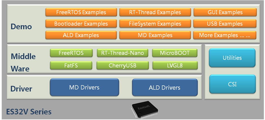 ES32V SDK是東軟載波微電子開發(fā)的、面向ES32V系列微控制器內(nèi)核以及外設(shè)的一套高集成、易使用、面向過程與對(duì)象相結(jié)合的驅(qū)動(dòng)庫(kù),包括MD、ALD、中間層驅(qū)動(dòng)。SDK兼容CSI標(biāo)準(zhǔn),可高效移植不同的操作系統(tǒng)、文件系統(tǒng)等第三方軟件。SDK集成了多方中間層軟件,中間層軟件對(duì)整個(gè)ES32V系列微控制器保持兼容,能夠做到不同平臺(tái)之間的簡(jiǎn)單移植。MD驅(qū)動(dòng)面向過程開發(fā),接近微控制器底層操作,提供用戶微控制器寄存器操作簡(jiǎn)單接口,操作方便,同時(shí)MD驅(qū)動(dòng)提供內(nèi)聯(lián)以及非內(nèi)聯(lián)調(diào)用函數(shù)的方式,最大化用戶代碼執(zhí)行效率。ALD驅(qū)動(dòng)對(duì)微控制器外設(shè)做抽象化操作,是一套抽象化的面向?qū)ο蟮尿?qū)動(dòng),用戶無需更多關(guān)注底層設(shè)備的原理,只需要調(diào)用相關(guān)外設(shè)的接口函數(shù)即可對(duì)外設(shè)進(jìn)行操作,ALD驅(qū)動(dòng)同時(shí)能夠?yàn)樯蠈討?yīng)用以及操作系統(tǒng)、文件系統(tǒng)等應(yīng)用和系統(tǒng)層軟件提供接口,提高移植的兼容性。此外為了更加方便用戶使用SDK開發(fā)項(xiàng)目,ESLinkIIPro/ESLinkIIOB、USB-Lab、ES-Bridge、SCONS自動(dòng)構(gòu)建工具、ES-PDS等軟件、硬件工具都已經(jīng)推出。使用ES32V SDK開發(fā)應(yīng)用程序可以大大縮減開發(fā)時(shí)間,降低開發(fā)難度,降低項(xiàng)目開發(fā)的開銷。